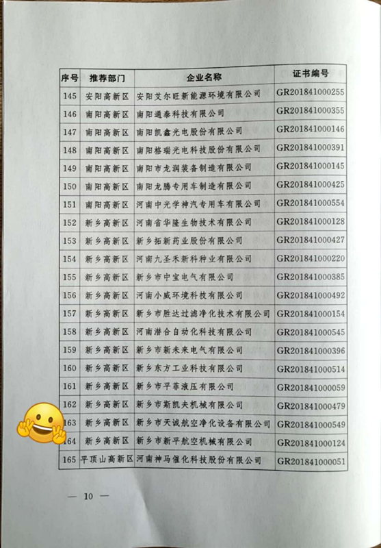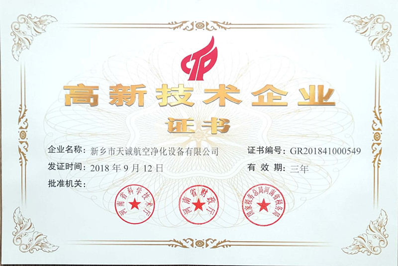 2018年12月,新鄉市天誠航空凈化設備有限公司獲高新技術企業認定,認定的通過,對公司業績將有積極影響,顯示了天誠公司自主研發、創新能力等方面的實力,也是國家主管部門對公司科技創新成果的肯定。